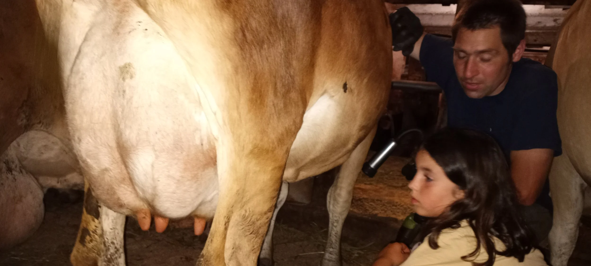 Brian Elliott teaches Alex Dilley how to milk a cow.