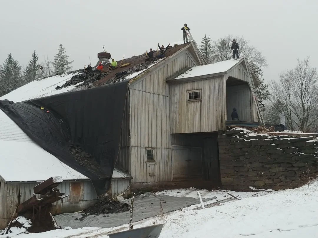 Ally Rooming from Schenectady stripped off 3 layers of shingles, put down plywood, ice dam and shingled the main part of the barn on December 29 & 30, 2021.Wow! right in the snow!